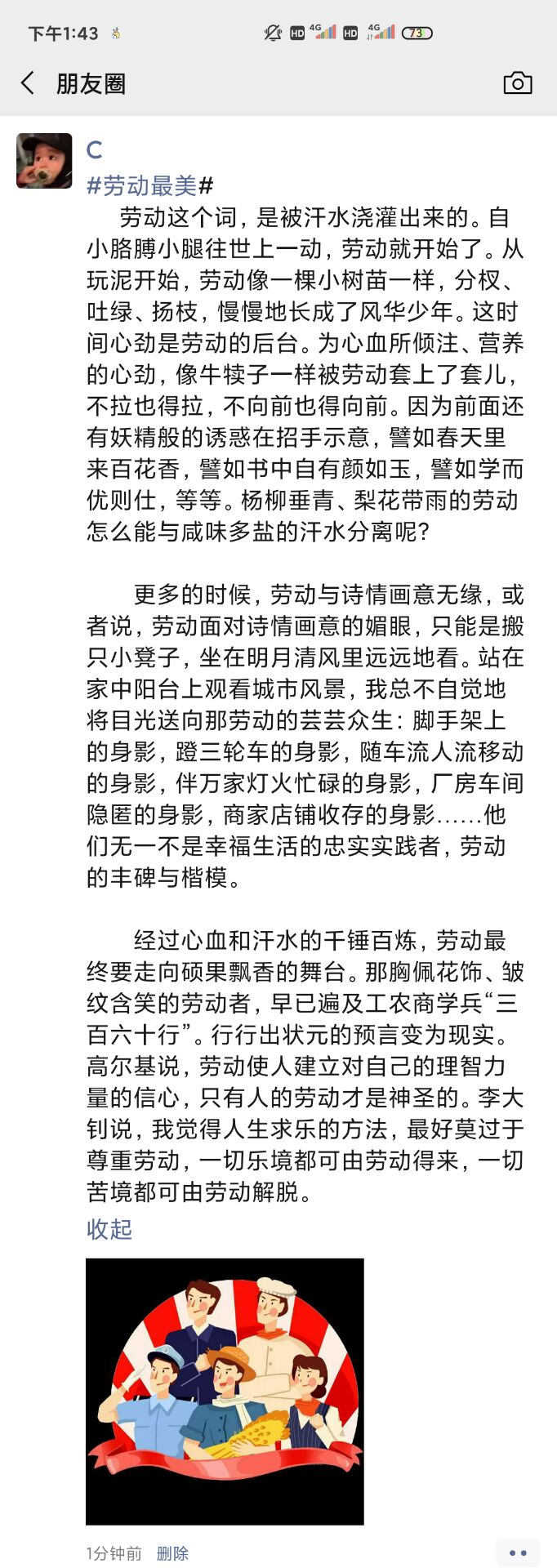 为深学笃用习近平新时代中国特色社会主义思想和党的十九届五中全会精神,贯彻落实中共中央、国务院《关于全面加强新时代大中小学劳动教育的意见》的文件精神,构建德智体美劳全面培养的教育体系,并响应学校“第二课堂”学生培育号召,2020年11月,77779193永利集团举行了线上“参与劳动,崇尚劳动”主题分享活动,倡导全体学院学生在各个网络平台上分享自己在劳动中的所思所想所感,帮助同学们树立正确的劳动观、价值观、成才观。