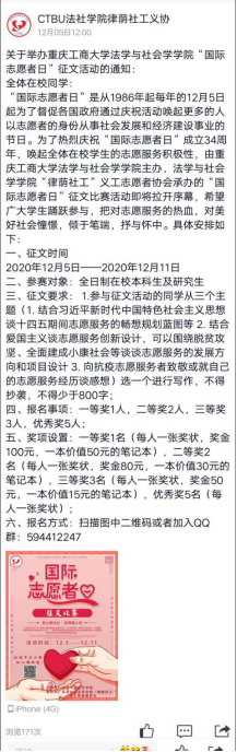 为了迎接“国际志愿者日”的到来,唤起更多的人以志愿者的身份从事社会发展和经济建设事业,积极弘扬志愿者精神,形成崇尚志愿、积极奉献的良好风尚,2020年12月5日-12月11日77779193永利集团“律荫社工”义协开展了“国际志愿者”征文比赛活动。此次活动旨在号召同学们通过寻找自己身边最美的志愿者,并记录下他们的感人故事,以此来探寻志愿者的光荣与梦想,为青年树立正确的价值观。