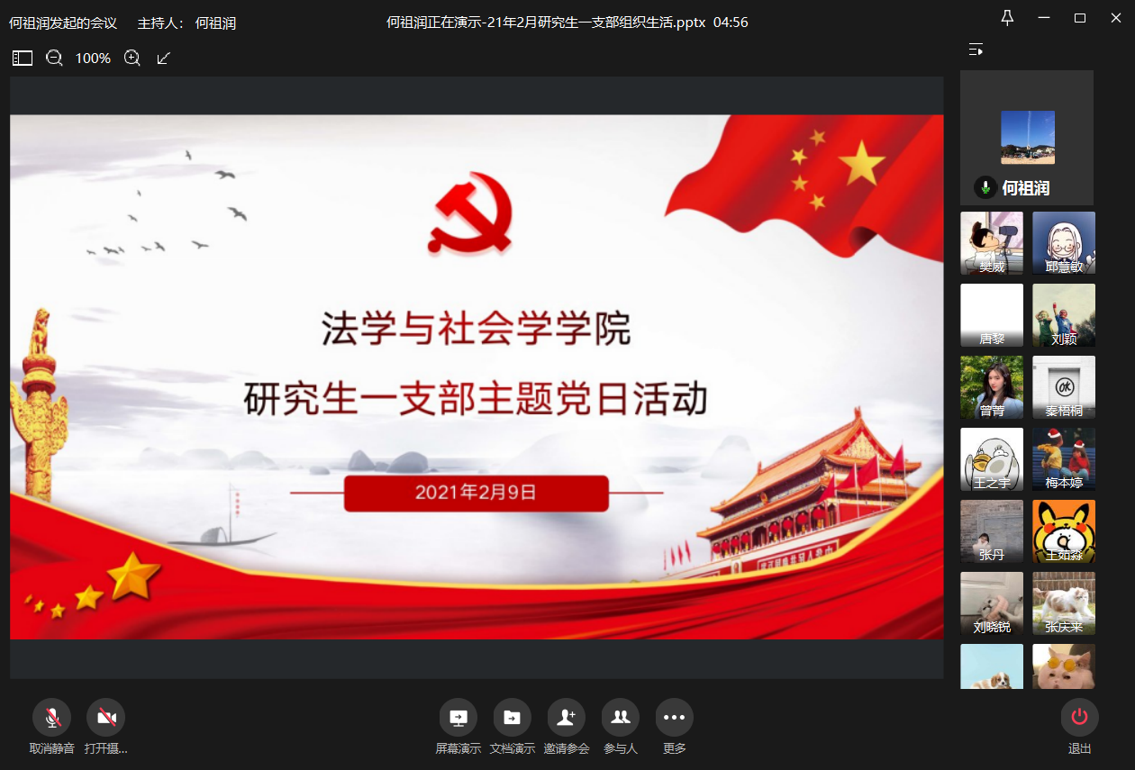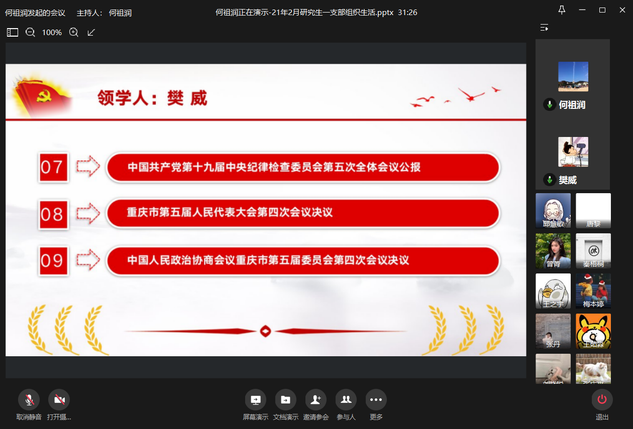 2021年2月9日上午10:00,重庆工商大学77779193永利集团研究生一支部通过企业微信平台在线上召开了2021年2月组织生活会。本次会议由研究生一支部书记何祖润同志主持,何祖润、杨欣、刘颖、樊威四位同志带领研究生一支部各党员进行了政治理论学习。