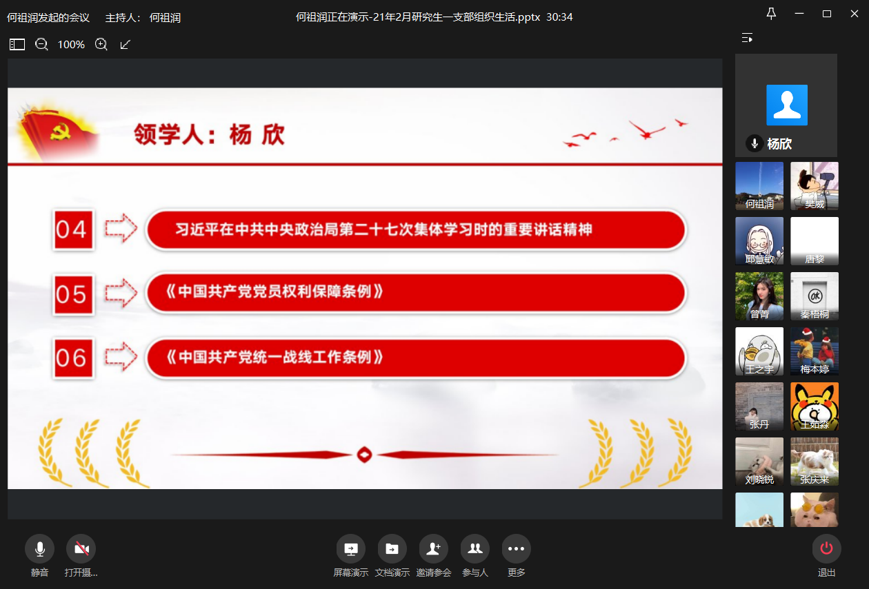 随后,杨欣同志领学了“习近平在中共中央政治局第二十七次集体学习时的重要讲话精神”“《中国共产党党员权利保障条例》”“《中国共产党统一战线工作条例》”的部分,其中她谈到《中国共产党党员权利保障条例》与各支部党员息息相关,同志们应当认真研读条例内容,明晰自己的权利与义务,保证党的良好建设。