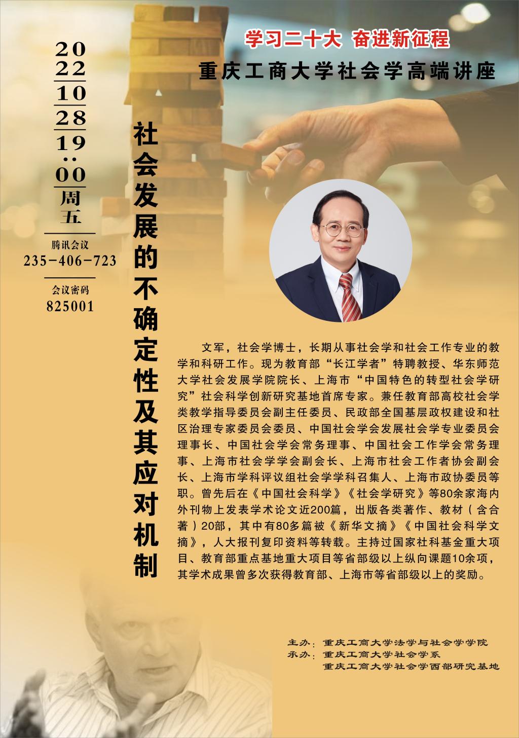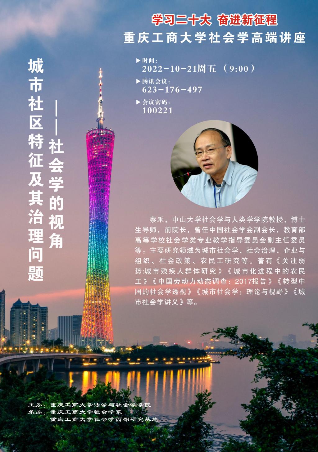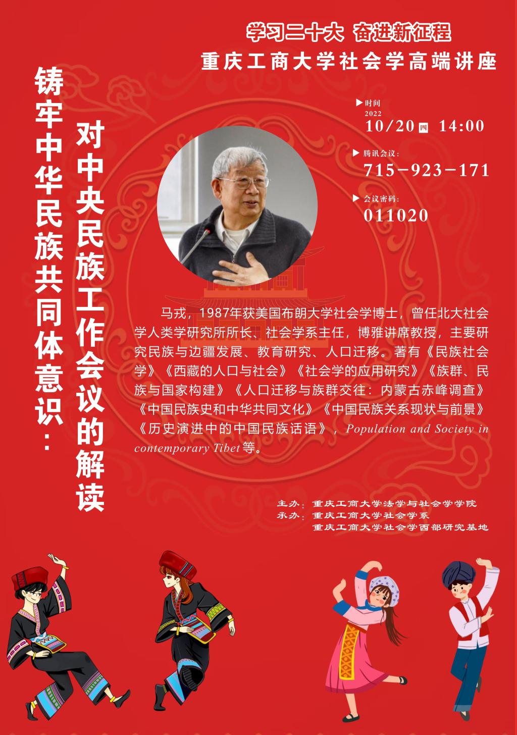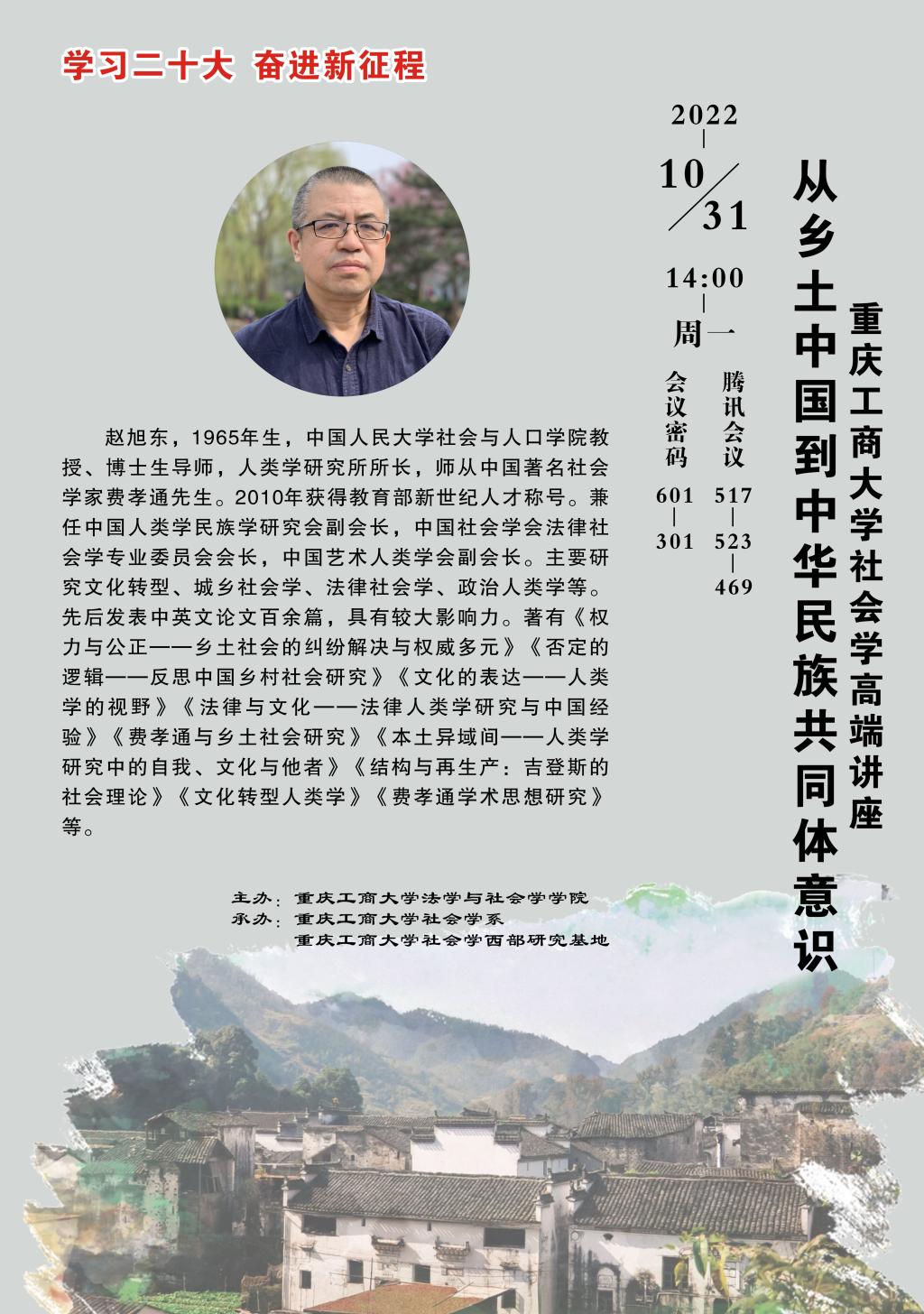 学习二十大,奋进新征程! 在二十大胜利召开之际,为推动重庆工商大学社会学重庆市“十四五”重点学科及一流专业建设,重庆工商大学社会学系、重庆工商大学社会学西部研究基地特举办社会学高端论坛。论坛为期一个月(2022.10.20-11.20),共计11场。论坛负责人:罗兆均(邮箱:545319529@qq.com)。具体安排如下: