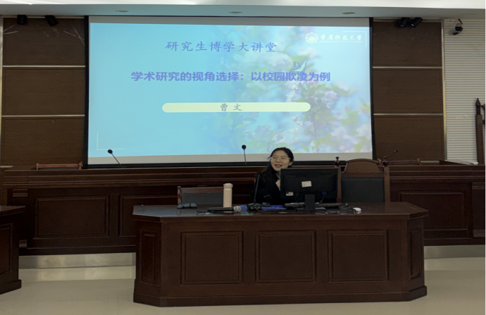 曹文博士围绕“学术研究的视角选择”,以“校园欺凌”为核心案例展开系统分享。曹老师首先阐释了视角在学术研究中的核心价值,指出视角是界定研究问题、选取分析方法、形成创新结论的关键前提。随后,她从社会学、法学、心理学、教育学等多学科视角对“校园欺凌”进行横向解构,分别从场域权力、法律责任、心理机制与预防干预等正面分析“校园欺凌”议题。在此基础上,她进一步讲解了如何从微观行为、中观制度、宏观社会结构层面纵向深挖研究切入点,结合时代背景拓展研究对象的迁移路径。