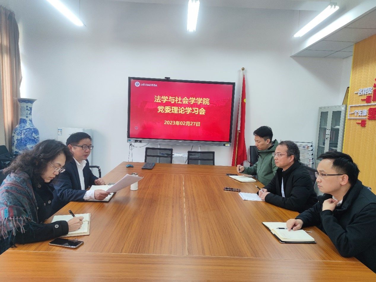 会上,党委书记李莉莎领学了国家主席习近平发表2023年新年贺词,她谈到,当前我们处在一个充满生机与活力的时代,一代又一代中国人在党的领导下,接续奋斗、不畏艰辛,创造了今天的辉煌中国,新的一年相信我们能在以中国式现代化全面推进中华民族伟大复兴的征程上一往无前、行稳致远。党委副书记陈琛领学了习近平发表的重要文章《谱写新时代中国宪法实践新篇章——纪念现行宪法公布实施40周年》,他表示,40年的实践充分证明了,现行宪法有力坚持了中国共产党的领导,有力保障了人民当家作主,有力促进了改革开放和社会主义现代化建设,要引导法学类专业的教师带头宣传宪法、坚决维护宪法的权威,为法治教育作出积极贡献。