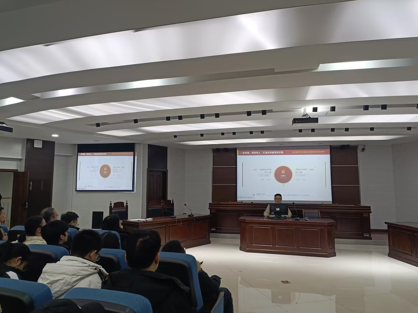 随后,学院院长刘勇讲话。他表示,教工一支部“党建 + 财经法治”模式,是财经法学专业发展的创新举措;教工二支部“四促进”“五部曲”推动党建与社会工作专博申报深度融合,成效显著。未来,学院将集中资源支持专博申报与财经法学特色建设,深化学科交叉融合;优化人才培养体系;整合实践资源,打造社会服务品牌,实现学科、人才、服务三位一体协同发展。