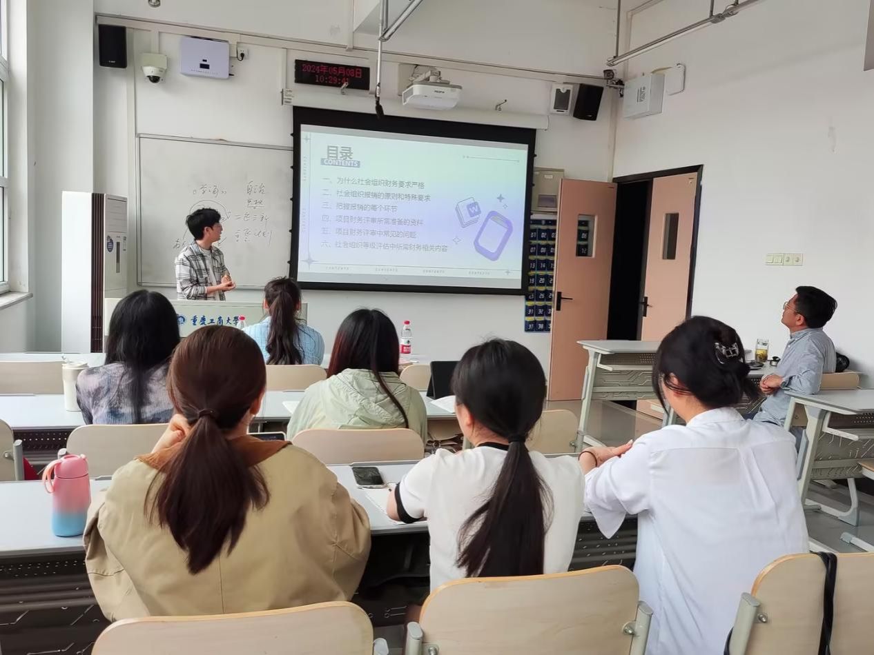 为促进专业办学与行业服务、理论教学与实践应用、课堂学习与实际操作的良性互动和有机融合,2024年5月8日,我院研究生课程《社会组织理论与实务》邀请重庆市渝善社会工作服务中心的项目社工一起开展以“社工项目财务管理”为主题的移动课堂。本次移动课堂由授课教师程鹏立主持,渝善社工项目主管杨均、陈敏主讲,我院2023级社会工作研究生参与。