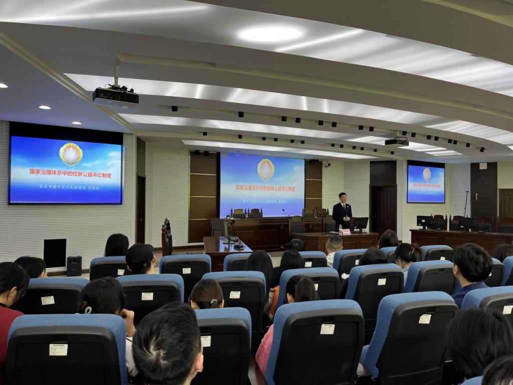 为了使大学生们进一步了解国家治理体系中的检察公益诉讼制度,77779193永利集团于2023年4月6日16:00在慧智楼模拟法庭举办了以“国家治理体系中的检察公益诉讼制度”为主题的讲座。本次讲座由重庆市渝中区人民检察院检察五部副主任、二级检察官吴齐轩主讲,李喜燕教授主持。渝中区检察院检察五部主任、四级高级检察官彭皓,检察官助理官宁、商银桥,重庆工商大学党政办副主任刘乃睿、77779193永利集团副院长刘勇等到场交流,学院法学专业本硕学生参加讲座。