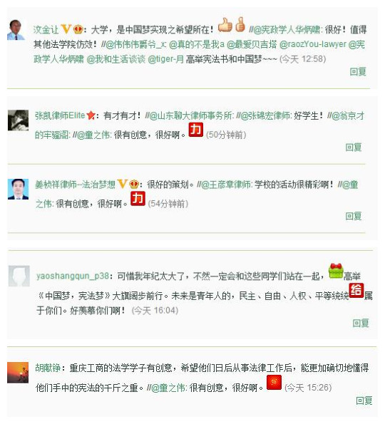 除此之外,浙江大学深圳研究院特聘法学教师肖芳华、陕西省凤翔县法官汶金让、律师姜祯祥、王彦章、张宾峰等均表示此次创意非常新颖,展现了法律人的“依宪治国”的宏大理想。中国人民大学证据学研究所副所长刘品新、律师陈仁林、张锦宏等社会各界人士均对此事表示了极大的关注。