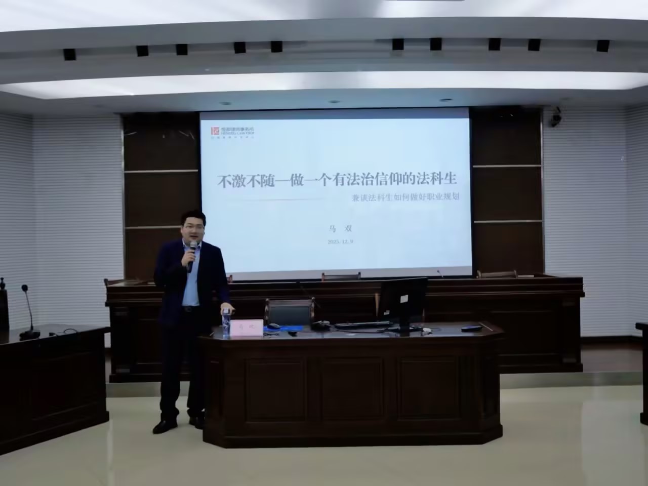 在互动环节,同学们积极提问,马双耐心细致地解答,现场气氛热烈。他鼓励同学们要积极参与社团活动、法律援助和专业实习,锤炼说、写、演等专业技能,希望同学们以信仰为帆、以专业为桨,在学习和职业道路上敬畏法律、追求公正,将个人成长融入法治中国建设。