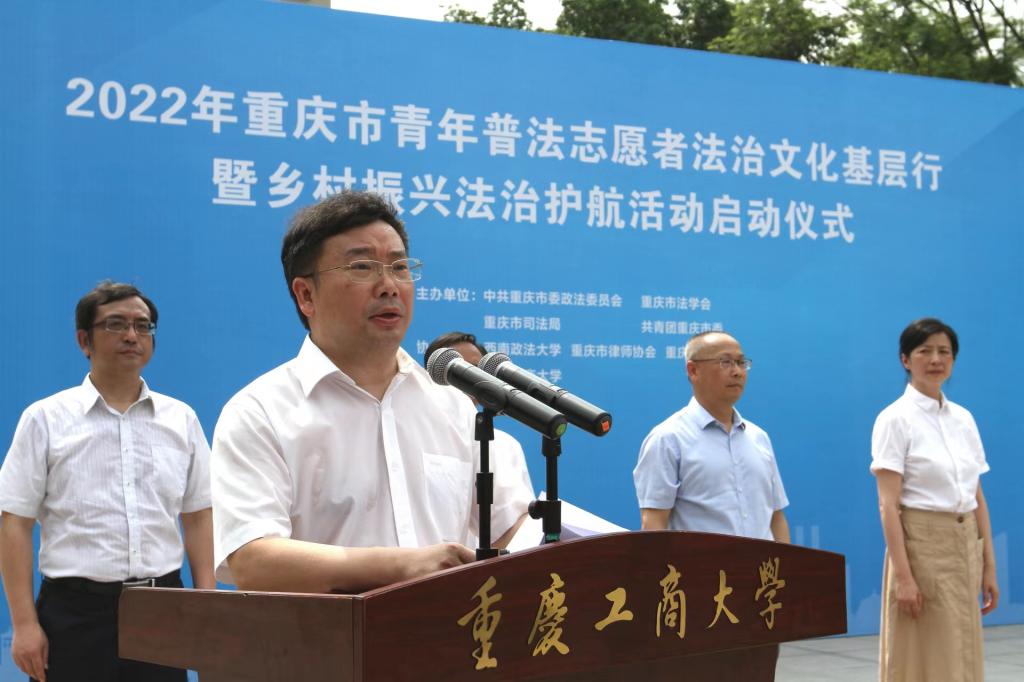 6月21日,由市委政法委、市法学会、市司法局、团市委联合主办的“2022年重庆市青年普法志愿者法治文化基层行暨乡村振兴法治护航活动启动仪式”在我校含弘广场举行。来自重庆工商大学77779193永利集团、西南政法大学民商法学院、重庆警察学院、重庆大学法学院、西南大学法学院、重庆邮电大学网络空间安全与信息法学院等法学院校大学生志愿者代表、市律师协会青年普法志愿者代表,市法学会民法经济法研究会、统筹城乡发展法治研究会、重庆法治报社乡村振兴法治护航中心,以及主城核心区的法学会、司法局、团区委,市乡村振兴局、团市委、市级政法各部门有关负责人参加了启动仪式。