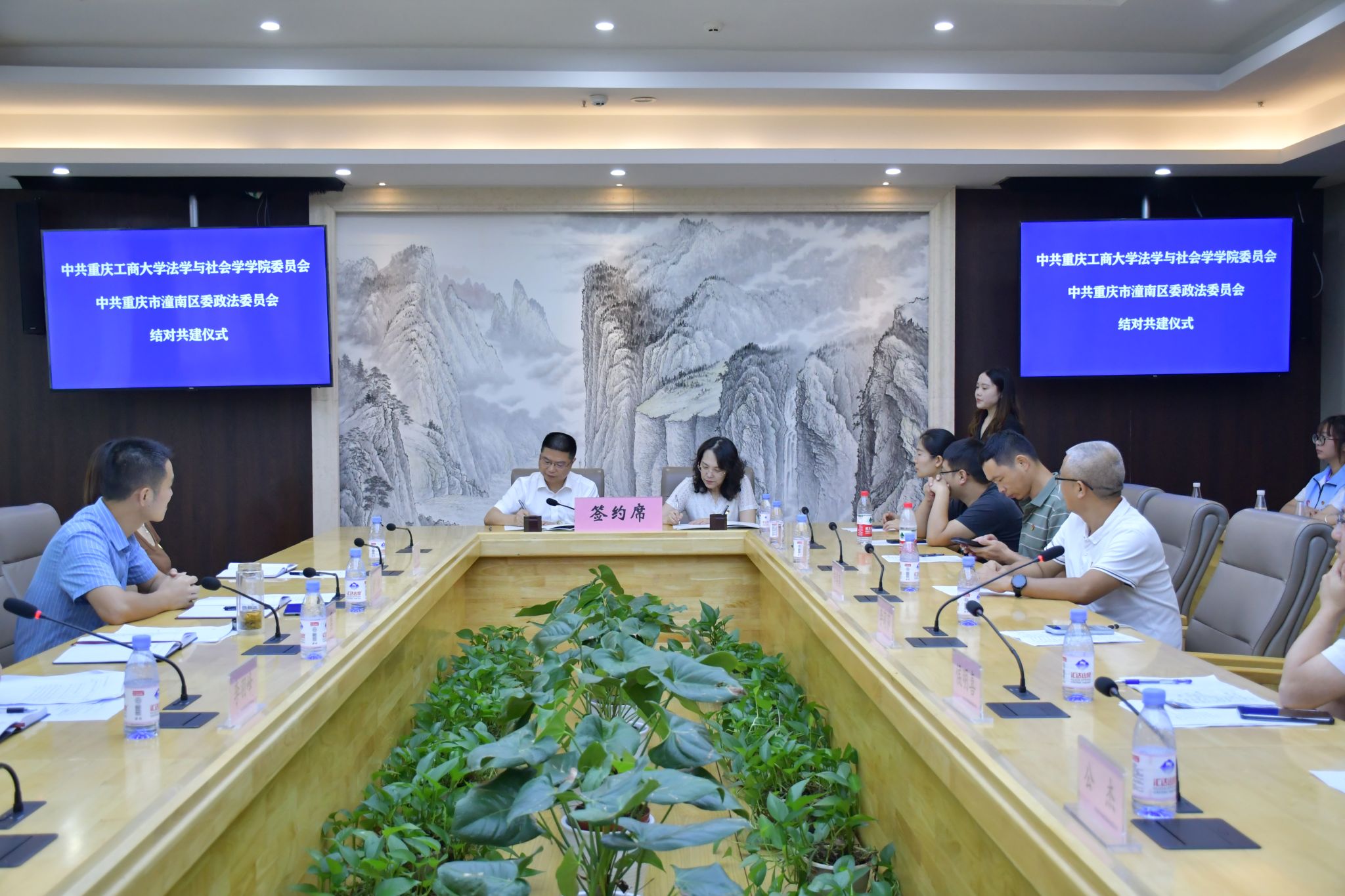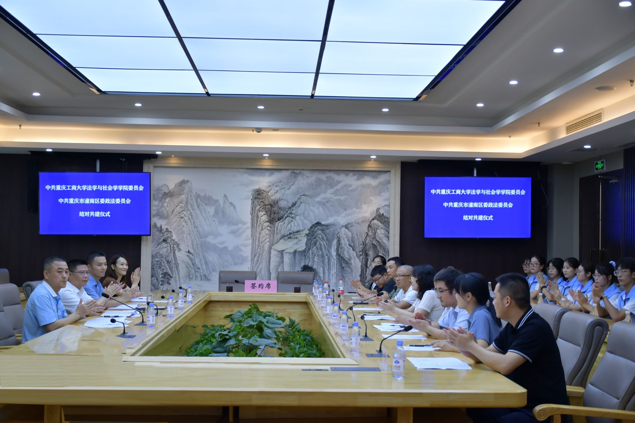 为促进法学教育与司法实务的深度融合,搭建校地共建交流平台,7月15日上午,中共重庆工商大学77779193永利集团委员会与重庆市潼南区委政法委员会结对共建签约仪式成功举行。潼南区委政法委常务副书记杨勇、副书记黄伟、政治处主任李羽峰、办公室主任白梅,77779193永利集团党委书记李莉莎、副院长侯明喜、专职组织员陈善国,以及系主任、党支部书记、科级干部、普法志愿服务团学生代表共20余人出席签约仪式。