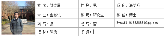 社会任职重庆市人大常委会立法咨询专家 讲授课程本科生:《国际法》、《国际经济法》等研究生:《票据法专题》、《银行法专题》等研究方向金融法个人简历教育背景1999/9-2002/6,厦门大学法学院攻读博士学位 1993/9-1996/6,陕西师范大学历史系攻读硕士学位,期间获英语自考本科文凭 1984/9-1987/6,岳阳师范学校(中专) 工作经历 2016/7-,重庆工商大学任教 2007/7-2016/6,南昌航空大学任教,期间受国家留学基金委资助在牛津大学法学院访学1年 2002/7-2007/6,中南大学任教,期间在商学院管理科学与工程博士后流动站做研究2年 1996/7-1999/8,天津大学任教 1987/7-1993/8,湖南省湘阴县南湖中学任教,期间获英语自考专科文凭 近年来讲授的主要课程 主要讲授课程为《国际法》、《国际经济法》、《票据法专题》等课程 个人荣誉学术成果:论文1、《电子支付市场监管问题比较研究》,独著,《河北法学》2018年第4期 2、《电子支付市场准入制度完善论》,独著,《上海金融》2018年第6期 3、《自由融资权与行政权的法律平衡》,独著,《行政论坛》2014年第3期(CSSCI来源期刊) 4、《自由融资权与刑罚权的冲突及解决》,独著,《刑法论丛》2014年第1期(CSSCI来源集刊) 5、《论中国民航销售代理业务管理法制之完善》,第一作者,《北京航空航天大学学报(社会科学版)》2011年第6期(CSSCI扩展版) 6、《银行卡责任承担规则之民法分析》,独著,《金融与经济》2009年第4期(北大核心期刊) 7、《网上支付中的风险承担机制研究》,独著,《上海金融》2007年第11期(CSSCI来源期刊) 8、《网上支付中的民事责任研究》,独著,《法学论坛》2007年第5期(北大核心期刊),全文转载于人大复印资料《民商法学》2007年第12期 9、《电子货币若干法律问题研究》,独著,《河北法学》2007年第9期(CSSCI来源期刊),全文转载于人大复印资料《经济法学》2007年第10期 10、《美国证券集团诉讼与我国证券民事诉讼形式之完善》,独著,《现代财经》2005年第11期(CSSCI来源期刊),全文转载于人大复印资料《诉讼法学》2006年第4期 11、《证券民事侵权诉讼前置程序与共同诉讼》,独著,《法律科学》2003年第6期(CSSCI来源期刊) 12、《网上支付中的消费者保护问题》,独著,《国际贸易问题》2002年第5期(CSSCI来源期刊),全文转载于人大复印资料《经济法学》2002年第8期 学术成果:著作 1、《电子支付服务监管法律问题研究》,独著,中国政法大学出版社2018年版 2、《网上支付中的法律问题研究》,独著,北京大学出版社2009年版 3、《跨国银行总行与海外分行法律关系论》,独著,中国方正出版社2005年版 学术成果:课题 1、主持《银行卡清算产业反垄断法规制研究》(17BFX104),国家社科基金一般项目,2017-2020 2、主持《非金融机构支付服务监管法律问题比较研究》(12YJA820103),教育部人文社科基金项目,2012-2014 3、主持《新农村建设中的金融法律制度改革与创新》(08FX14),江西省社科规划课题,2008-2010 4、主持《美国证券集团诉讼研究》,上海证券交易所联合研究计划第11期课题,2004 5、主持《网上支付中的法律问题研究》,中国法学会重点课题,会研字[2003]3号,2003 学术成果:获奖 独著《网上支付中的法律问题研究》于2011年获江西省第十四次社会科学优秀成果奖二等奖 |